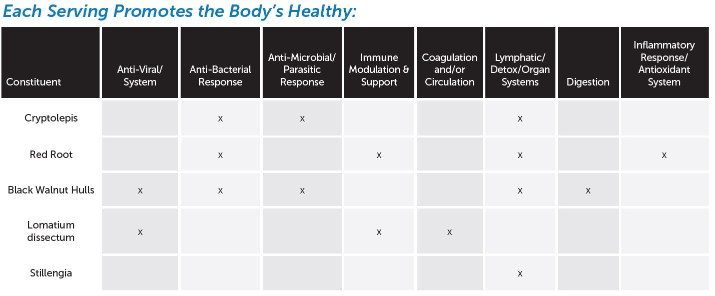 Contains cryptolepis, red root, black walnut hulls, lomatium and stillengia for support of parasitic infections